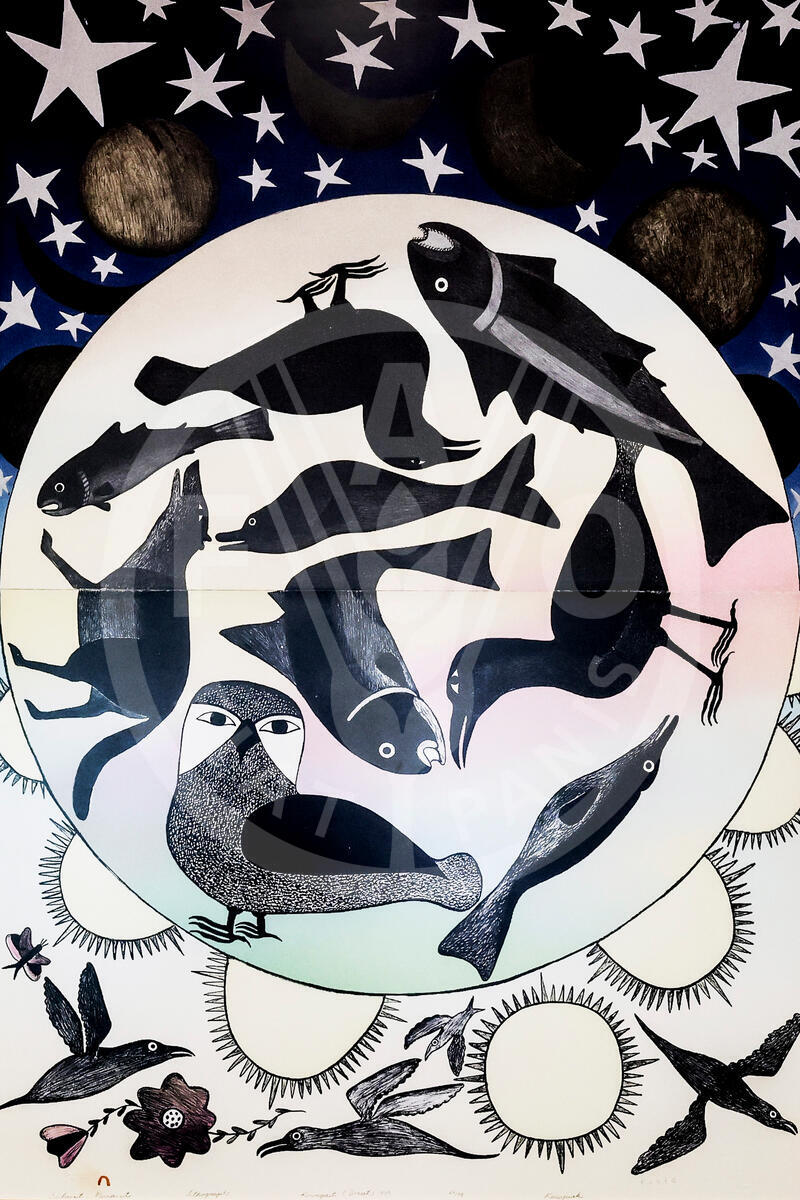 01 August 2025, Rome, Italy. A reproduction of an illustration that celebrate Indigenous traditions, by local artist Wayne Yerxa, who used delicate lithographs on rice paper to tell the stories and rituals is on display in the Canada Room. FAO Headquarters.