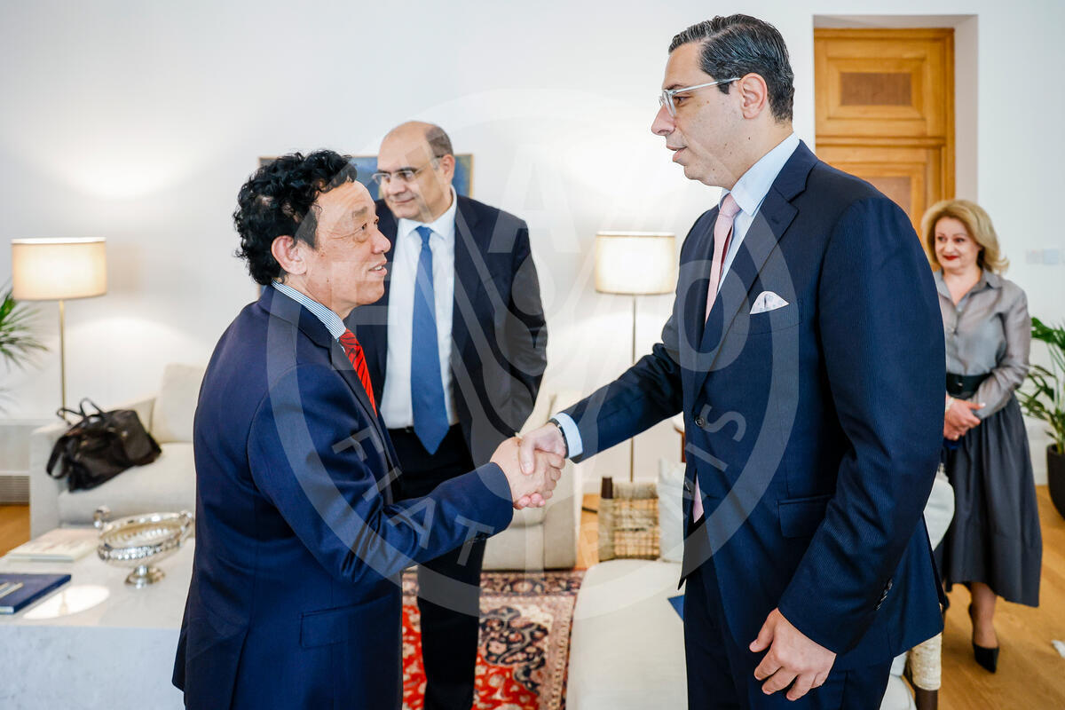 06 June 2025. Nicosia, Cyprus. FAO Director-General QU Dongyu (L) meets Kōnstantinos Kompos, Minister for Foreign Affairs of Cyprus at presidential palace in Nicosia.
