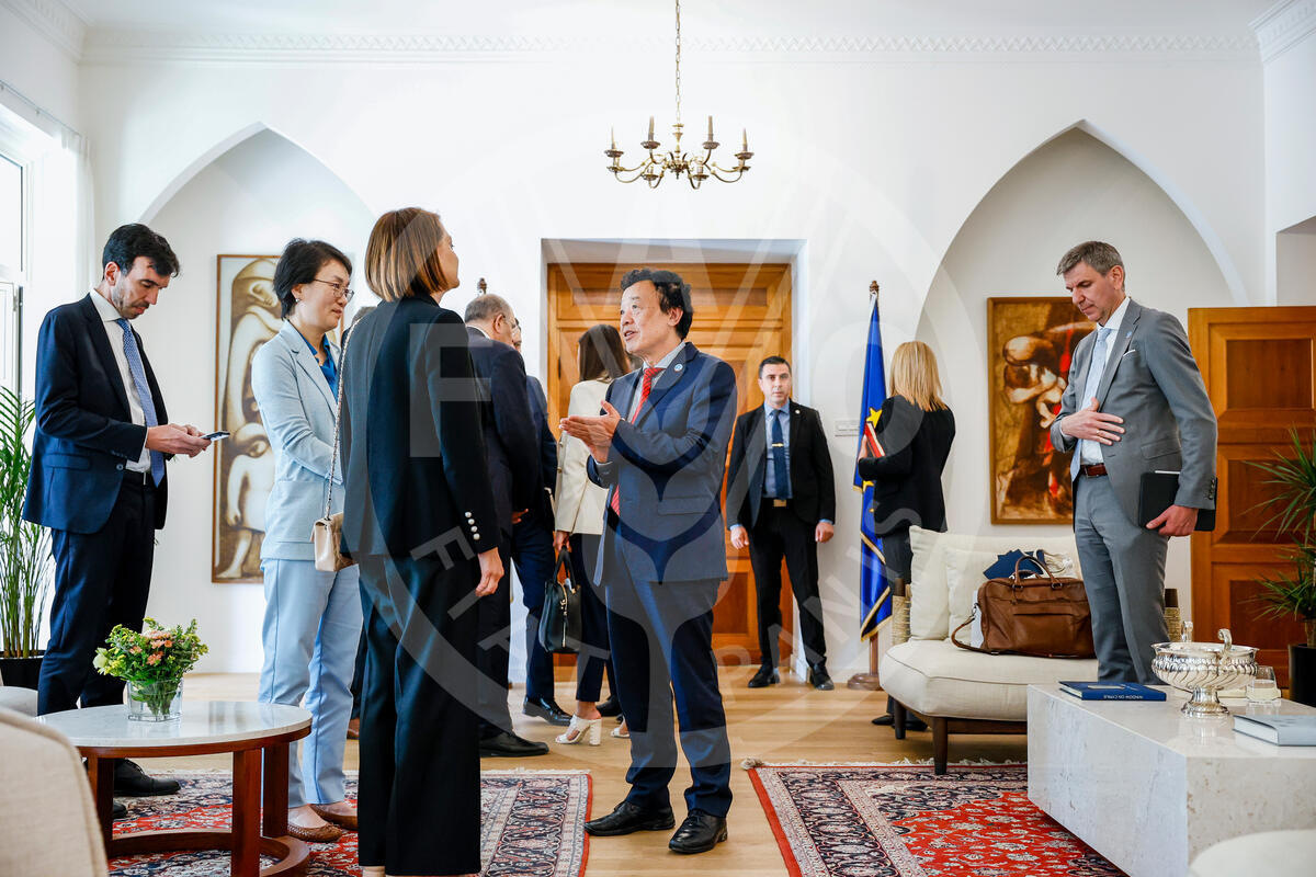 06 June 2025. Nicosia, Cyprus. FAO Director-General QU Dongyu (C) with his delegation at the presidential palace after the meeting with President of the Republic of Cyprus, Nikos Christodoulidīs.