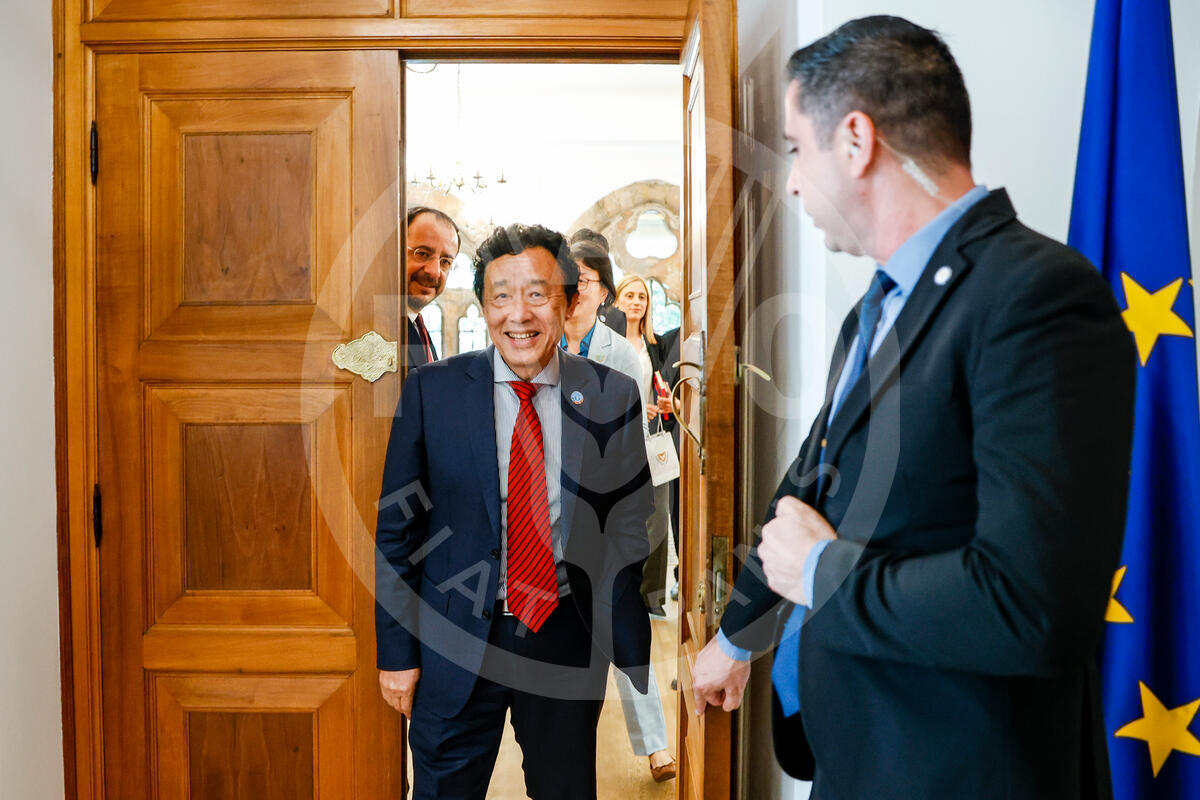 06 June 2025. Nicosia, Cyprus. FAO Director-General QU Dongyu (C) leaves from the office of the President of the Republic of Cyprus, Nikos Christodoulidīs (Behind FAO Director-General) after the meeting with his delegation at the presidential palace.