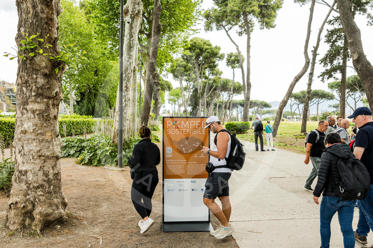 15 May 2025. Pompeii, Italy. Workers install totems in Pompeii site, built as part of the “Sustainable Pompeii” project, created by FAO in collaboration with the Archaeological Park of Pompeii and the Italian Ministry of Foreign Affairs and International Cooperation (MAECI).