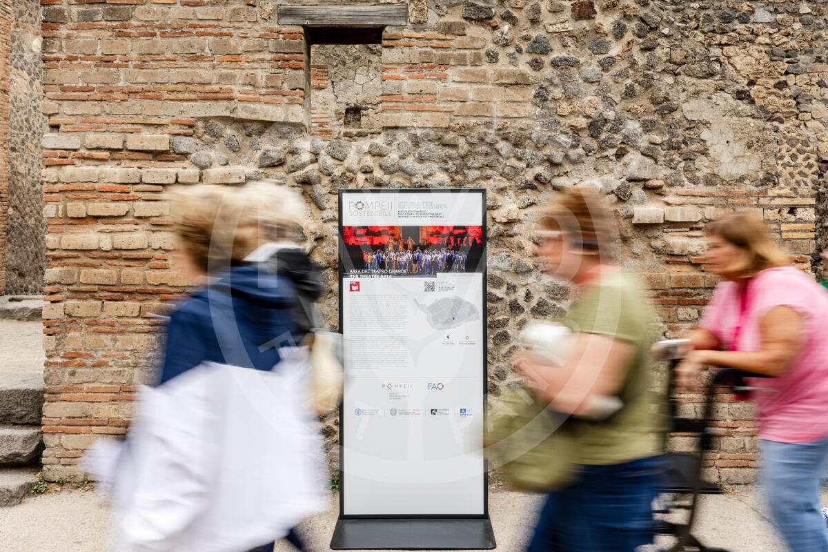 15 May 2025. Pompeii, Italy. Workers install totems in Pompeii site, built as part of the “Sustainable Pompeii” project, created by FAO in collaboration with the Archaeological Park of Pompeii and the Italian Ministry of Foreign Affairs and International Cooperation (MAECI).