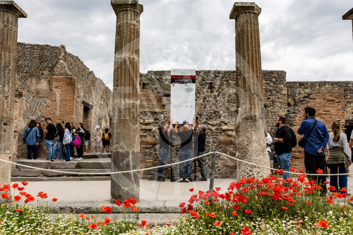 15 May 2025. Pompeii, Italy. Workers install totems in Pompeii site, built as part of the “Sustainable Pompeii” project, created by FAO in collaboration with the Archaeological Park of Pompeii and the Italian Ministry of Foreign Affairs and International Cooperation (MAECI).