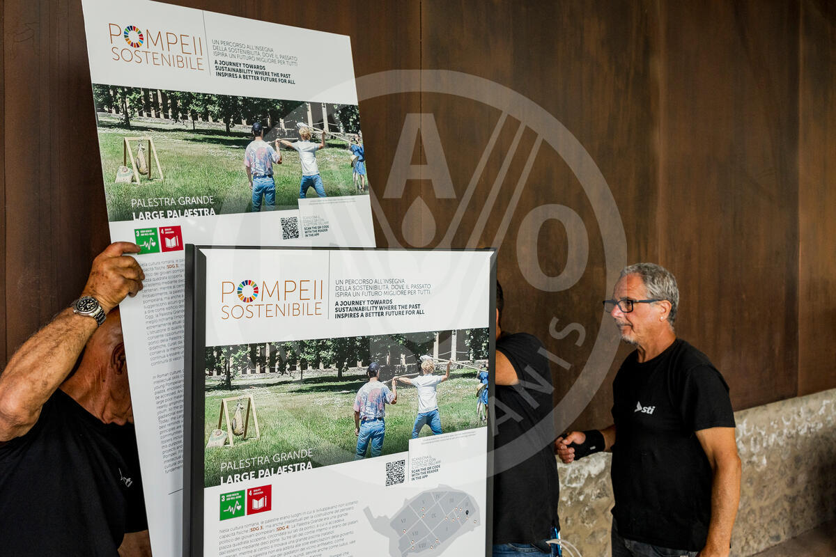 15 May 2025. Pompeii, Italy. Workers install totems in Pompeii site, built as part of the “Sustainable Pompeii” project, created by FAO in collaboration with the Archaeological Park of Pompeii and the Italian Ministry of Foreign Affairs and International Cooperation (MAECI).