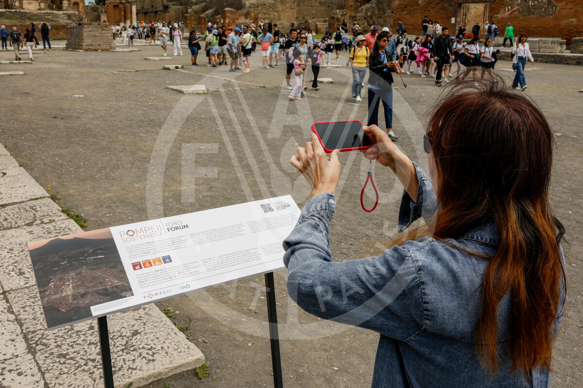 15 May 2025. Pompeii, Italy. Tourists next to a totem installed in the Pompeii site, built as part of the "Sustainable Pompeii" project, created by FAO in collaboration with the Archaeological Park of Pompeii and the Ministry of Foreign Affairs and International Cooperation (MAECI).