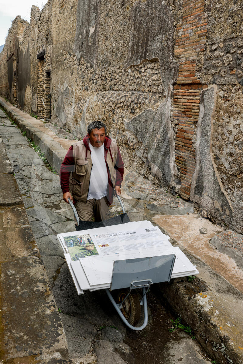 15 May 2025. Pompeii, Italy. Workers transport the totems at the Pompeii site, built as part of the “Sustainable Pompeii” project, created by FAO in collaboration with the Archaeological Park of Pompeii and the Italian Ministry of Foreign Affairs and International Cooperation (MAECI).