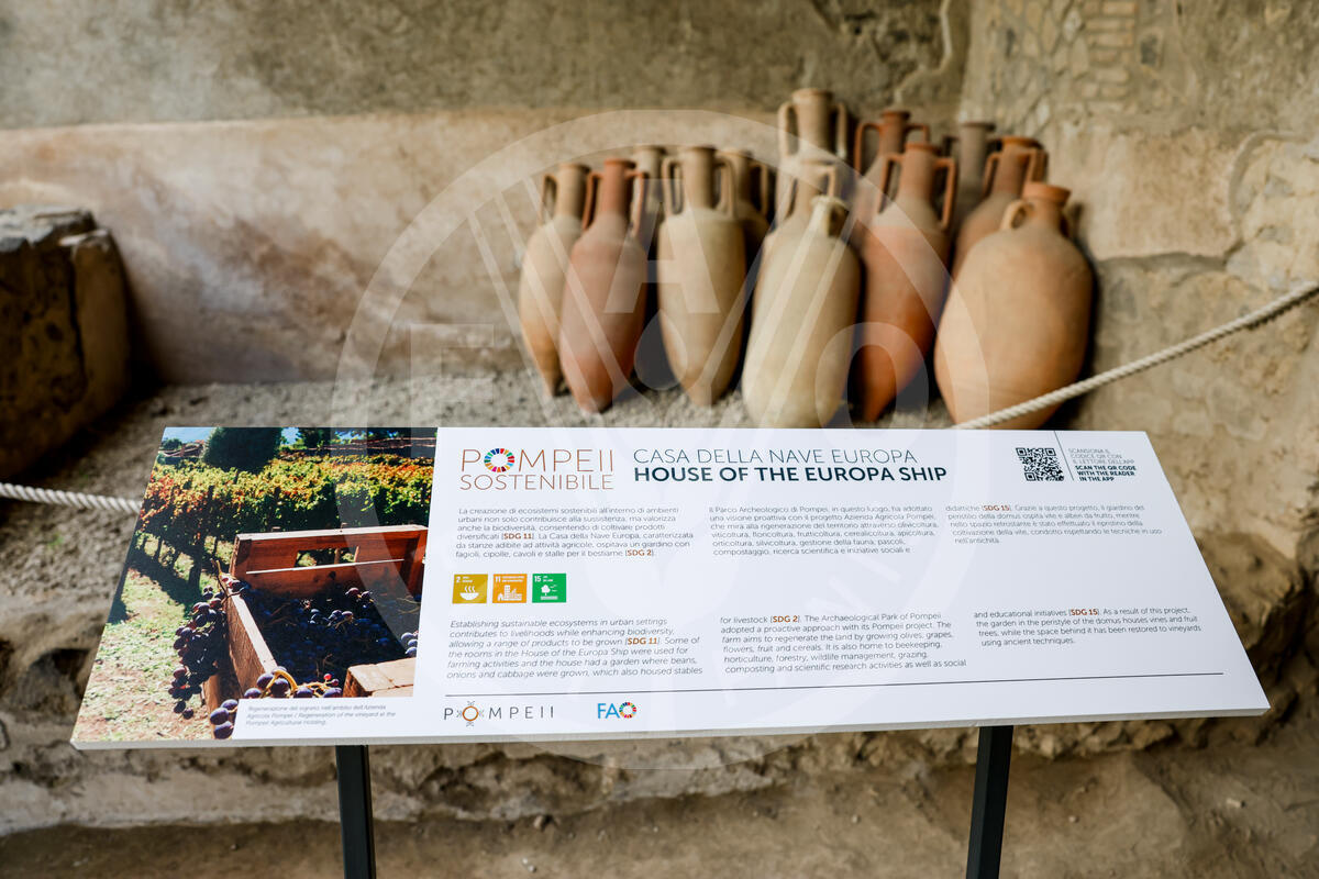 15 May 2025. Pompeii, Italy. A totem installed in Pompeii site, built as part of the “Sustainable Pompeii” project, created by FAO in collaboration with the Archaeological Park of Pompeii and the Italian Ministry of Foreign Affairs and International Cooperation (MAECI).