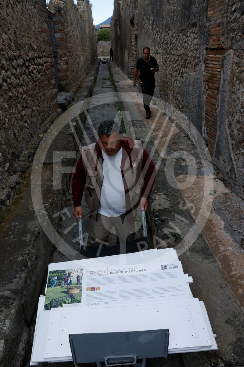 15 May 2025. Pompeii, Italy. Workers transport the totems at the Pompeii site, built as part of the “Sustainable Pompeii” project, created by FAO in collaboration with the Archaeological Park of Pompeii and the Italian Ministry of Foreign Affairs and International Cooperation (MAECI).