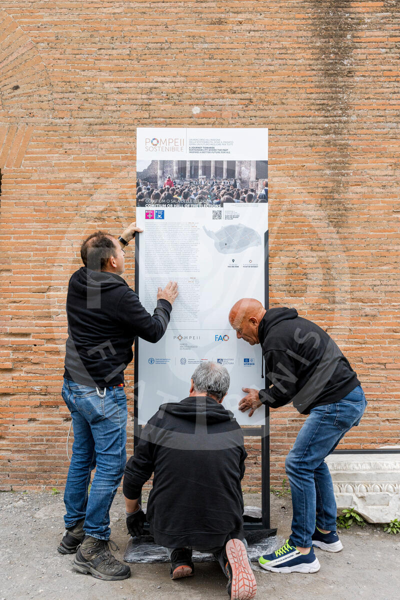 15 May 2025. Pompeii, Italy. Workers install totems in Pompeii site, built as part of the “Sustainable Pompeii” project, created by FAO in collaboration with the Archaeological Park of Pompeii and the Italian Ministry of Foreign Affairs and International Cooperation (MAECI).