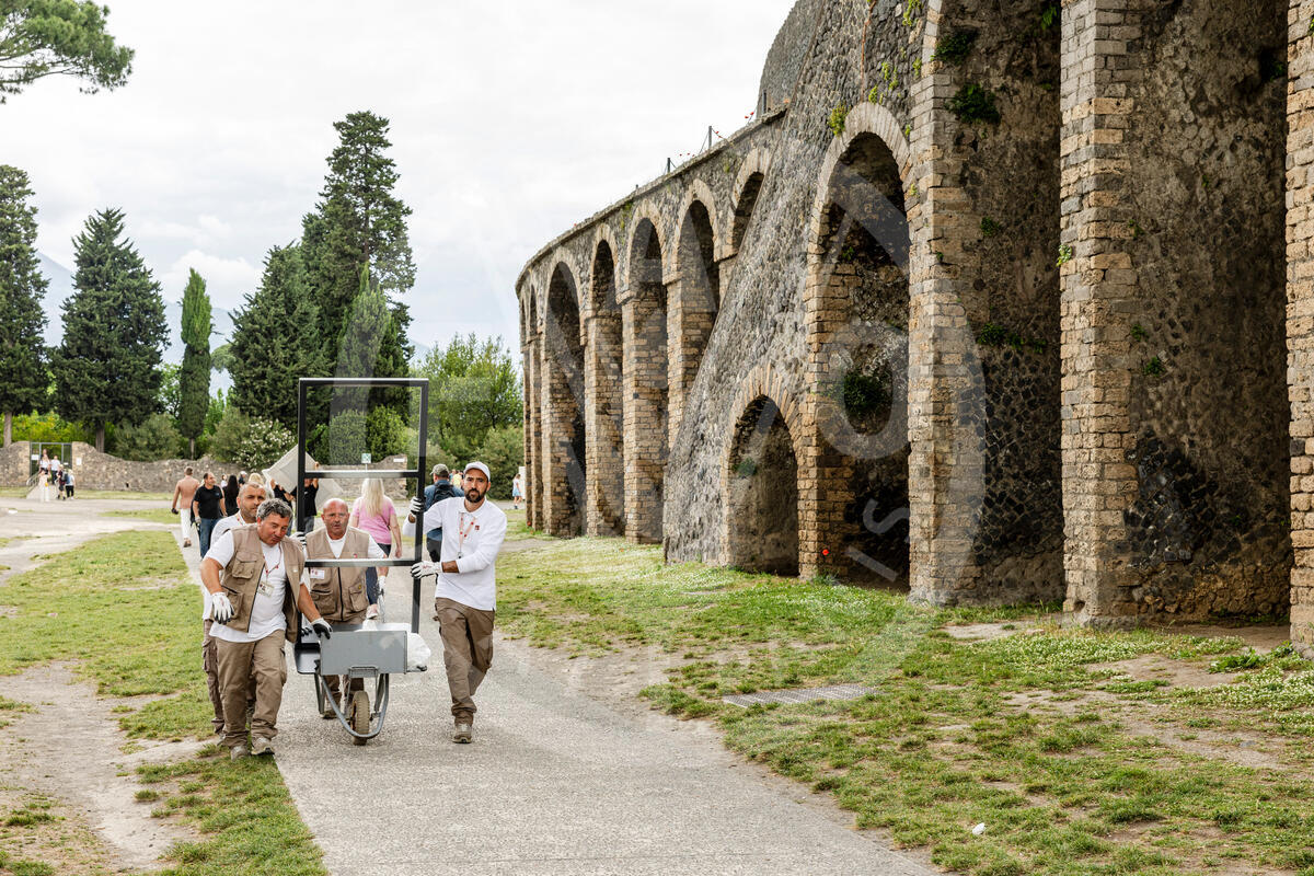 15 May 2025. Pompeii, Italy. Workers transport a totem at the Pompeii site, built as part of the “Sustainable Pompeii” project, created by FAO in collaboration with the Archaeological Park of Pompeii and the Italian Ministry of Foreign Affairs and International Cooperation (MAECI).
