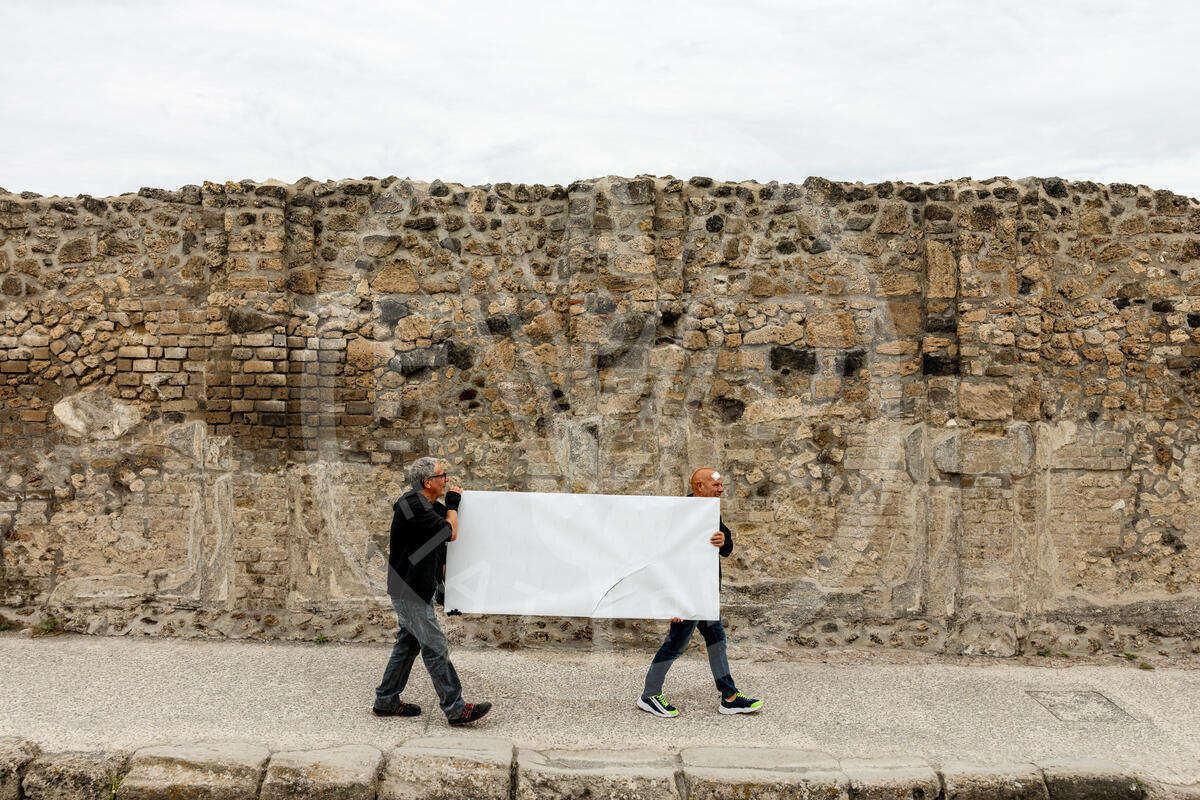 15 May 2025. Pompeii, Italy. Workers transport a totem at the Pompeii site, built as part of the “Sustainable Pompeii” project, created by FAO in collaboration with the Archaeological Park of Pompeii and the Italian Ministry of Foreign Affairs and International Cooperation (MAECI).