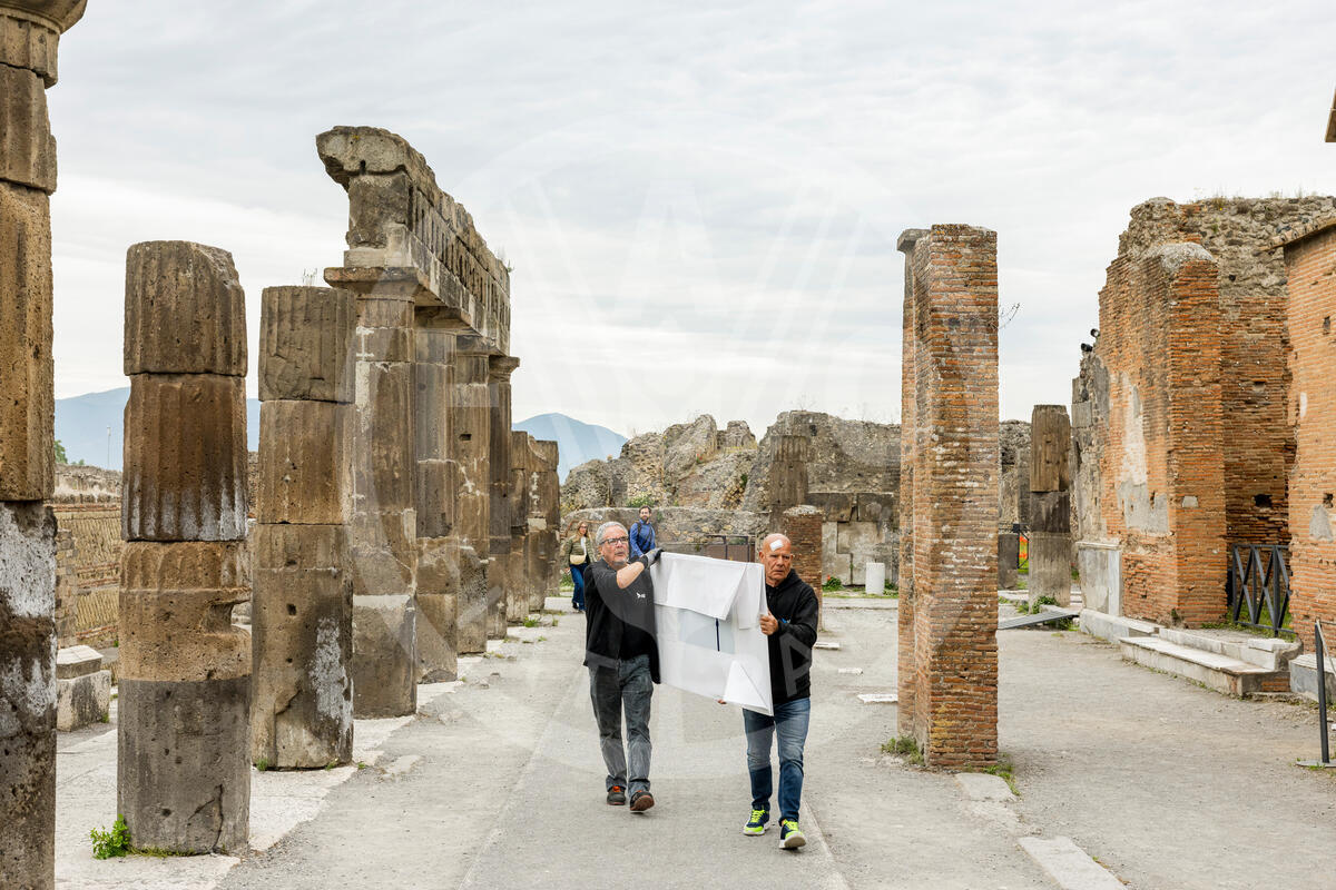 15 May 2025. Pompeii, Italy. Workers transport a totem at the Pompeii site, built as part of the “Sustainable Pompeii” project, created by FAO in collaboration with the Archaeological Park of Pompeii and the Italian Ministry of Foreign Affairs and International Cooperation (MAECI).