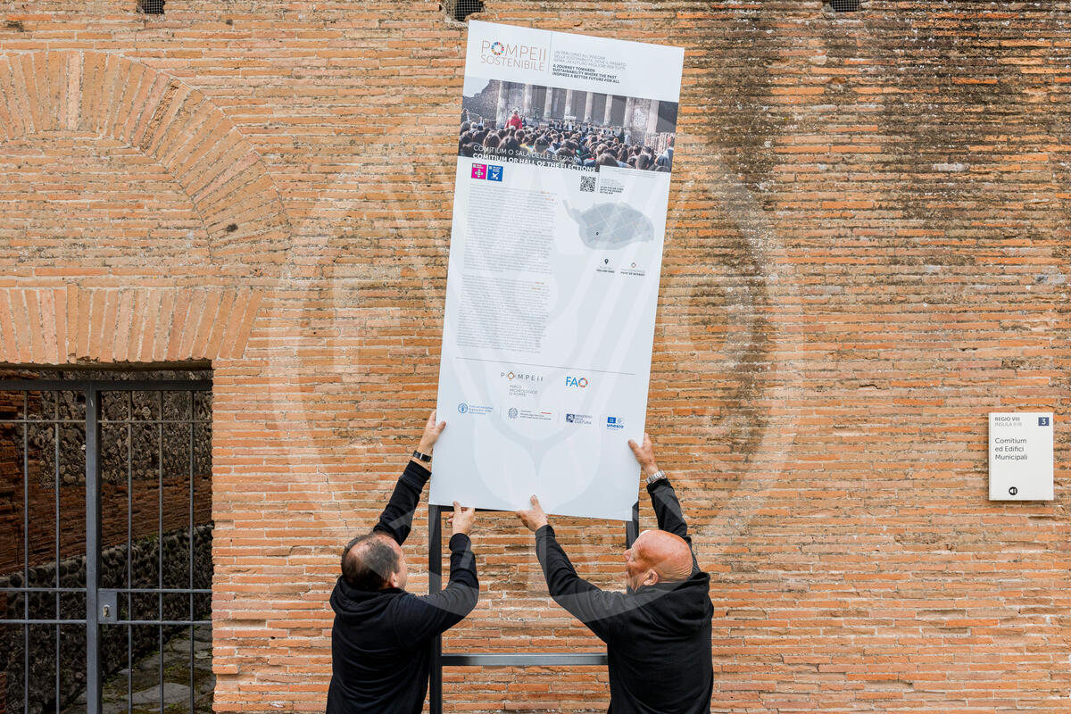 15 May 2025. Pompeii, Italy. Workers install totems in Pompeii site, built as part of the “Sustainable Pompeii” project, created by FAO in collaboration with the Archaeological Park of Pompeii and the Italian Ministry of Foreign Affairs and International Cooperation (MAECI).