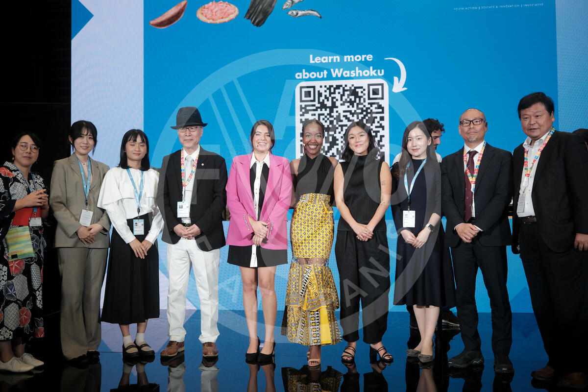 17 October 2024. Sheikh Zayed Centre, FAO Headquarters, Rome, Italy. A group photo of participants and speakers at the "Culture and Gastronomy: Spotlight on Washoku" session during the World Food Forum.