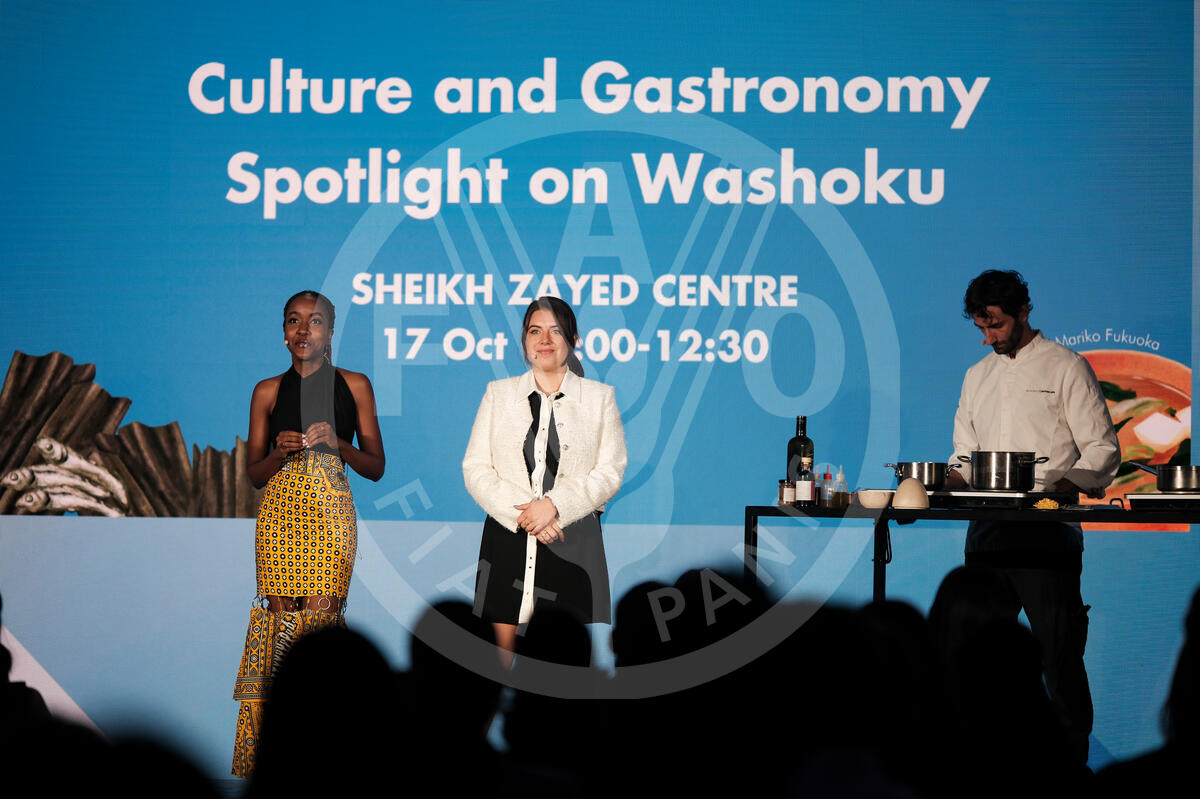 17 October 2024. Sheikh Zayed Centre, FAO Headquarters, Rome, Italy. Amanda Namayi and Lyndsey Hook moderate Washoku Culture and Gastronomy: Spotlight on Washoku