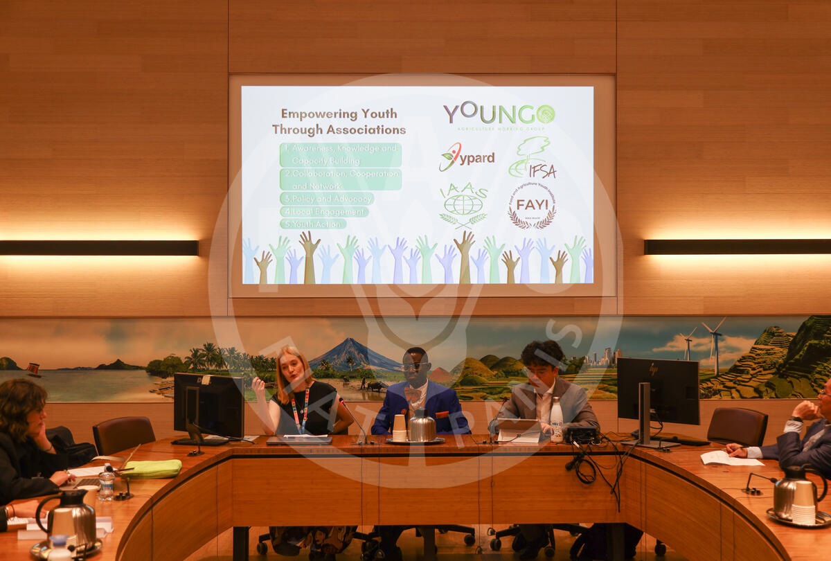 17 October 2024. Philippine Room, FAO Headquarters, Rome, Italy. View of the panelists and participants of Education for empowering youth in agriculture, aquaculture and fisheries.