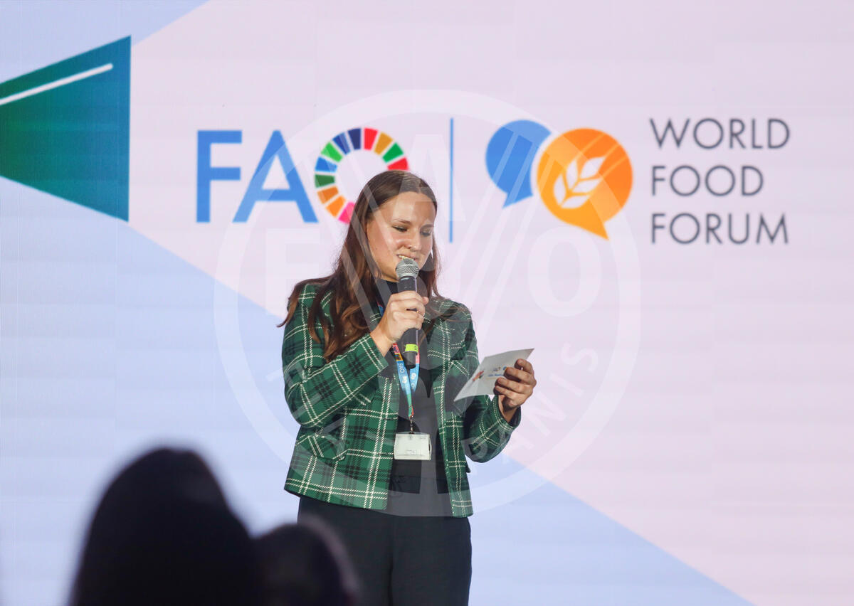 16 October 2024. Sheikh Zayed Centre, FAO Headquarters, Rome, Italy. View of a moderator of the World Food Forum Film Festival 2024.