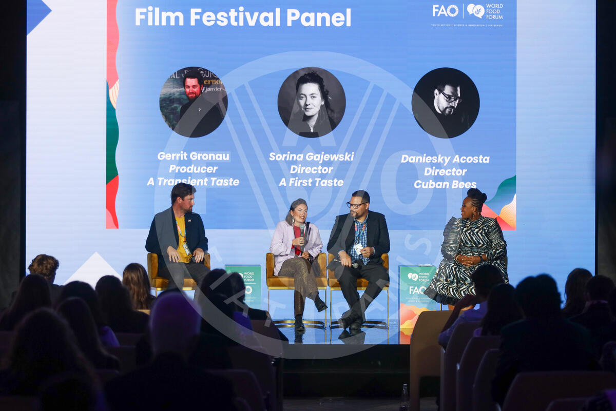16 October 2024. Sheikh Zayed Centre, FAO Headquarters, Rome, Italy. View of the panelists addressing the World Food Forum Film Festival 2024.