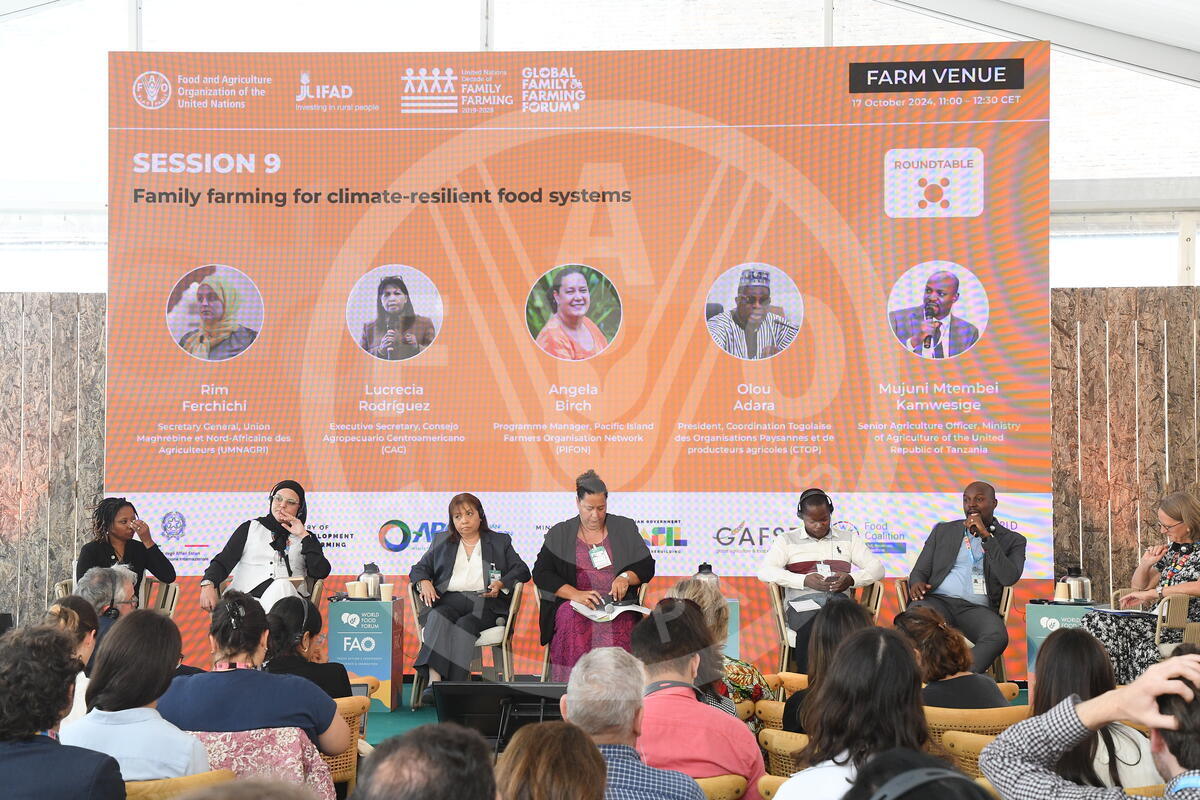 17 October 2024. Farm Venue, FAO Headquarters, Rome, Italy. View of panelists of Session 9: Family farming for climate-resilient food systems at the World Food Forum 2024.