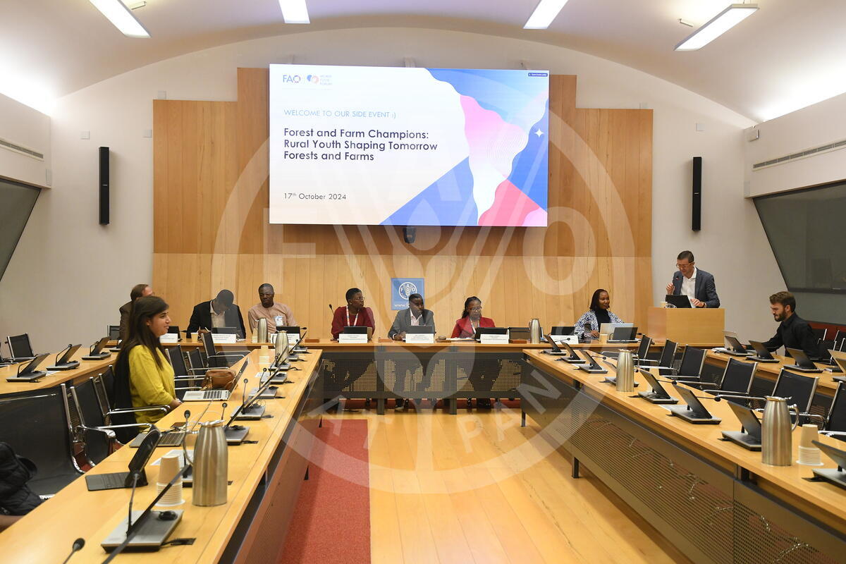 17 October 2024. German Room, FAO Headquarters, Rome, Italy. View of panelists and attendees at Forest and Farm Champions: Rural Youth Shaping Tomorrow Forest and Farms.
