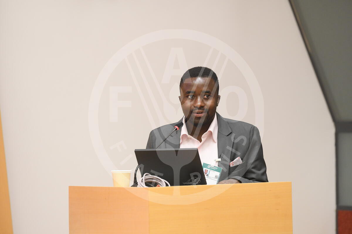 17 October 2024. German Room, FAO Headquarters, Rome, Italy. Abel Kamfwa, Programs Officer, Zambia National Forest Commodities Association, gives his speech at Forest and Farm Champions: Rural Youth Shaping Tomorrow Forest and Farms.