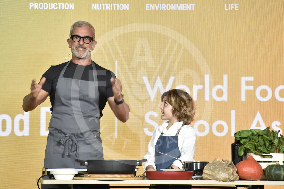 17 October 2024. Plenary Hall, FAO Headquarters, Rome, Italy. Chef, TV host and FAO Food Hero Max Mariola, with his son Mario, at the Global School Assembly and Junior World Food Day.