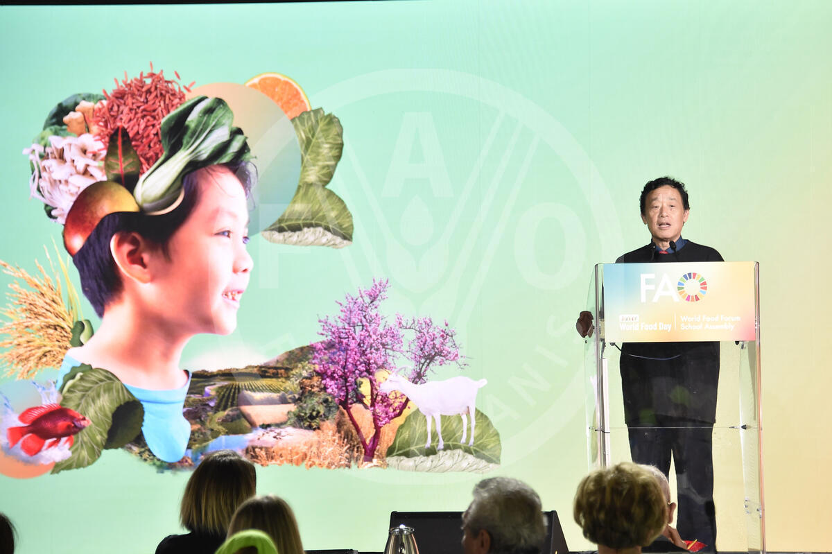 17 October 2024. Plenary Hall, FAO Headquarters, Rome, Italy. QU Dongyu, FAO Director-General, gives his speech at the Global School Assembly and Junior World Food Day.