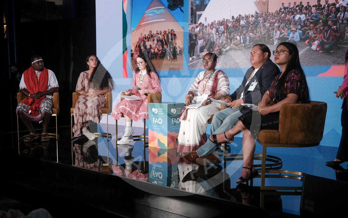 18 October 2024. Sheikh Zayed Centre, FAO Headquarters, Rome, Italy. View of the panelists of the Indigenous youth voices in the implementation of the UN Global Indigenous Youth Forum outcomes.