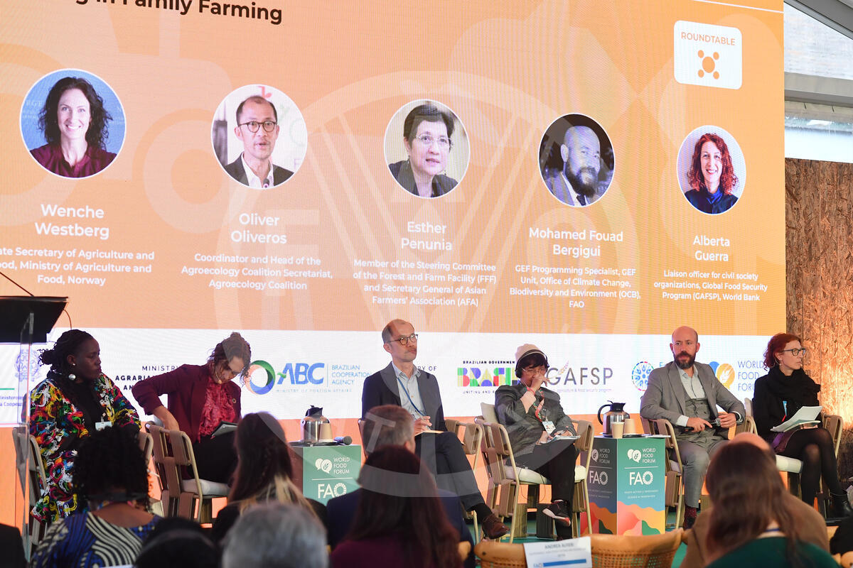 16 October 2024. Farm Venue, FAO Headquarters, Rome, Italy. View of the speakers at the Investing in Family Farming event
