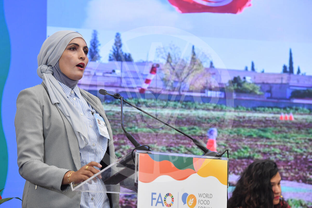 17 October 2024. Red Room, FAO Headquarters, Rome, Italy. Dr. Khaoula Abrougui, Assistant Professor at the High Institute of Agronomy of Chott Meriem University of Sousse, Tunisia, gives her speech at the Joint SIF & Youth Forum: EmPOWERing Youth through innovative sustainable mechanization and digitalization.