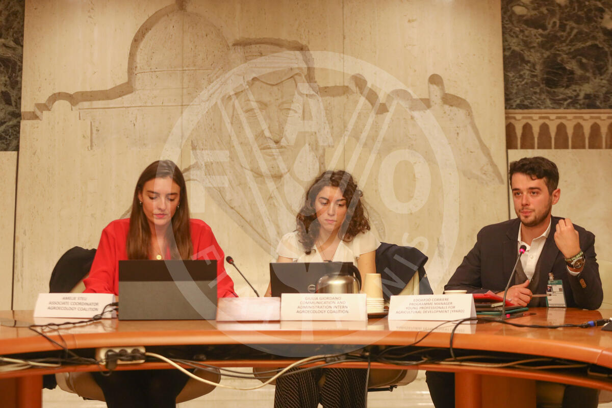 16 October 2024. King Faisal, FAO Headquarters, Rome, Italy. View of the speakers of the Youth in the Agroecological Trasformation: Insights from Youth Networks around the world.