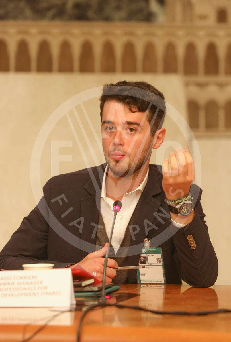 16 October 2024. King Faisal, FAO Headquarters, Rome, Italy. Edoardo Corriere, Programme Manager of Young Professional for Agricutural Development, gives his speech at the Youth in the Agroecological Trasformation: Insights from Youth Networks around the world.