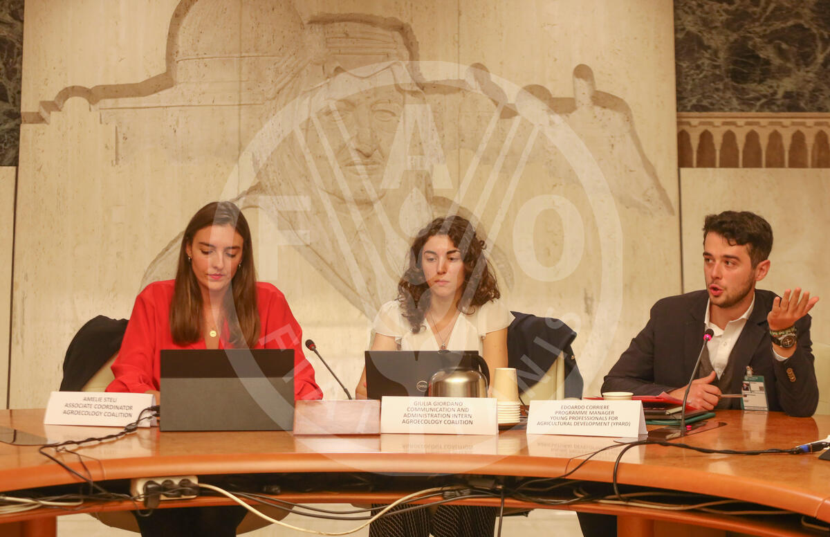 16 October 2024. King Faisal, FAO Headquarters, Rome, Italy. View of the speakers of the Youth in the Agroecological Trasformation: Insights from Youth Networks around the world.