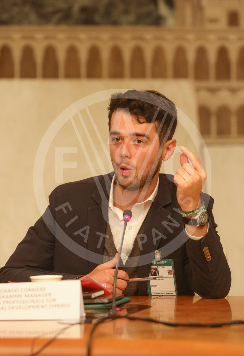 16 October 2024. King Faisal, FAO Headquarters, Rome, Italy. Edoardo Corriere, Programme Manager of Young Professional for Agricutural Development, gives his speech at the Youth in the Agroecological Trasformation: Insights from Youth Networks around the world.