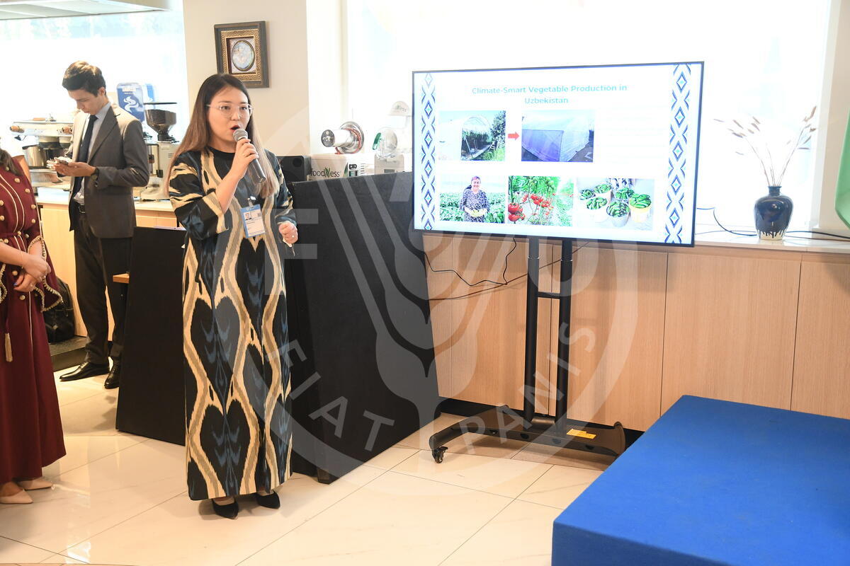 16 October 2024. Uzbekistan Lounge, FAO Headquarters, Rome, Italy. A student of the National Youth Delegation gives her speech at Uzbekistan Lunch: Culture Meets Innovation event.