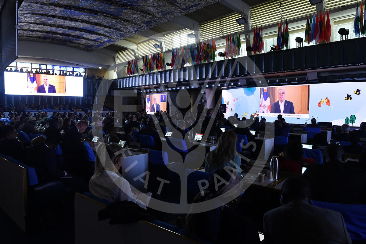 14 October 2024. Plenary Hall, FAO Headquarters, Rome, Italy. H.E. Luis Rodolfo Abinader Corona, President of the Dominican Republic, speaks at the World Food Forum Grand Opening.