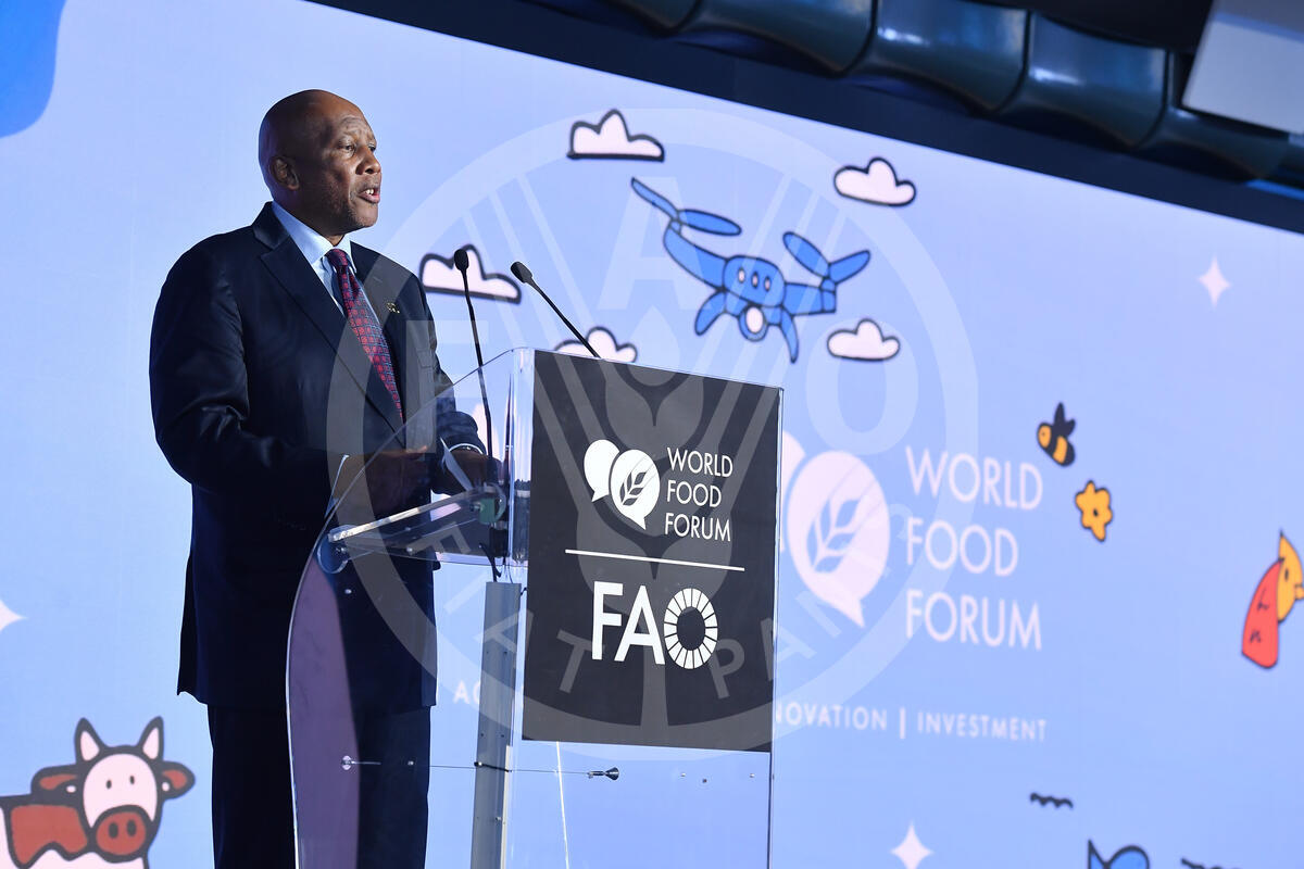 14 October 2024. Plenary Hall, FAO Headquarters, Rome, Italy. King Letsie III of Lesotho speaks on stage at the World Food Forum Grand Opening Ceremony.