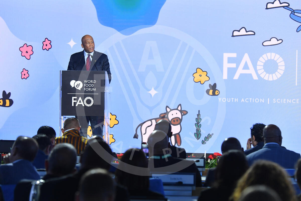 14 October 2024. Plenary Hall, FAO Headquarters, Rome, Italy. King Letsie III of Lesotho speaks on stage at the World Food Forum Grand Opening Ceremony.