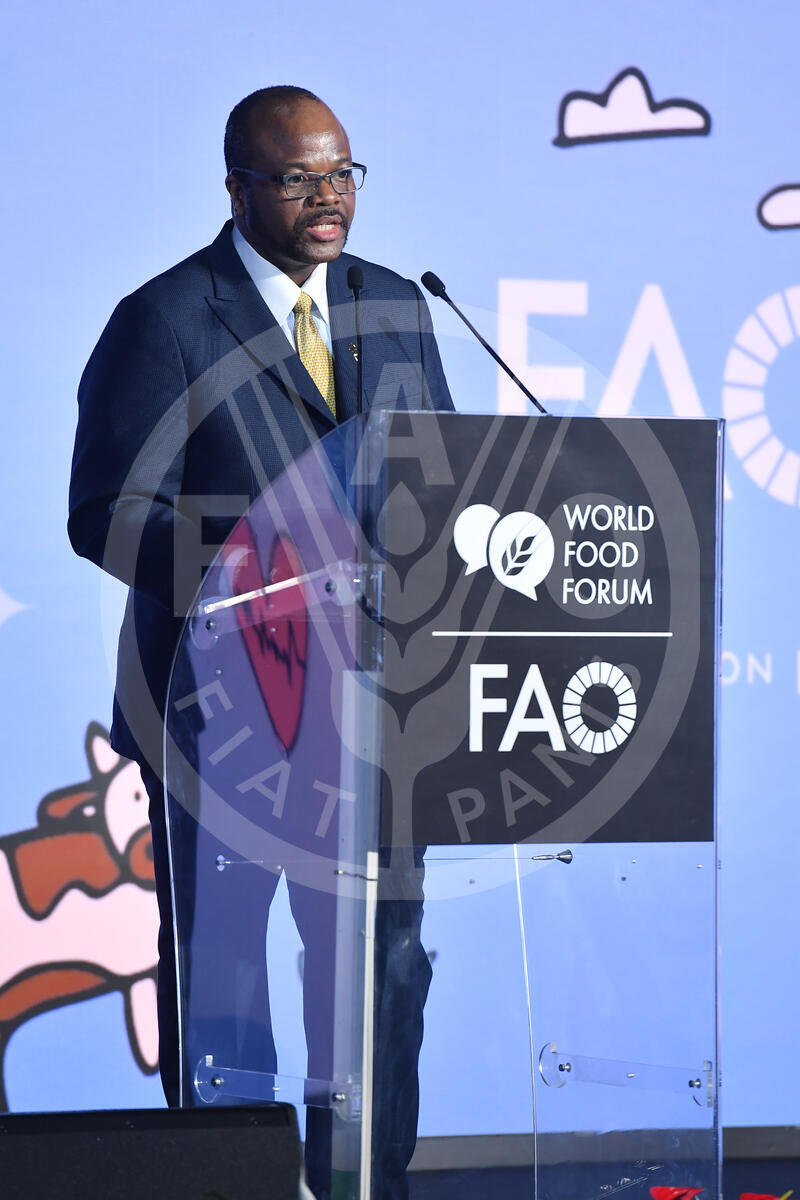 14 October 2024. Plenary Hall, FAO Headquarters, Rome, Italy. King Mswati III of Eswatini speaks to attendees during the World Food Forum Grand Opening Ceremony.