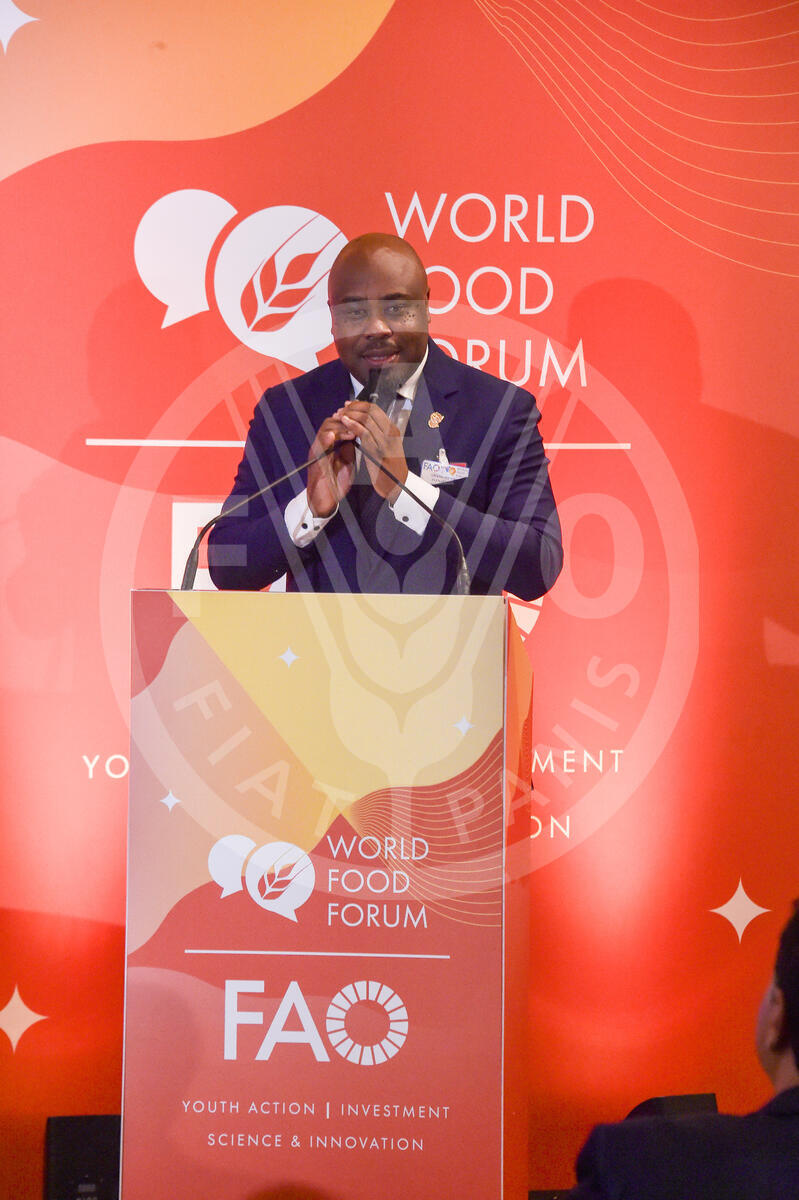 15 October 2024. Iran Room, FAO Headquarters, Rome, Italy. Hon. Dr. Bright Kanyontore Rwamirama, Minister of State for Animal Industry at the Ministry of Agriculture, Animal Industry and Fisheries of Uganda, talks at the World Food Forum Presentation of the Hand-in-Hand country investment plans for Tanzania and Uganda