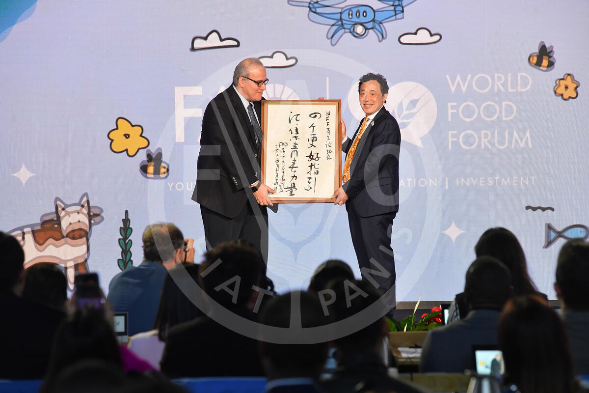 14 October 2024. Rome, Italy. FAO Director-General QU Dongyu gives his calligraphy as a gift to Máximo Torero, FAO Chief Economist and Youth Committee Chair at the World Food Forum Youth Assembly Opening Ceremony.