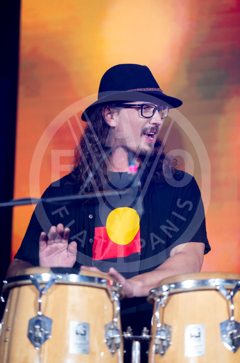14 October 2024. Sheikh Zayed Centre, FAO Headquarters, Rome, Italy. The Australian band Family Shoveller performs with traditional Australian instruments at the WFF Youth Concert.