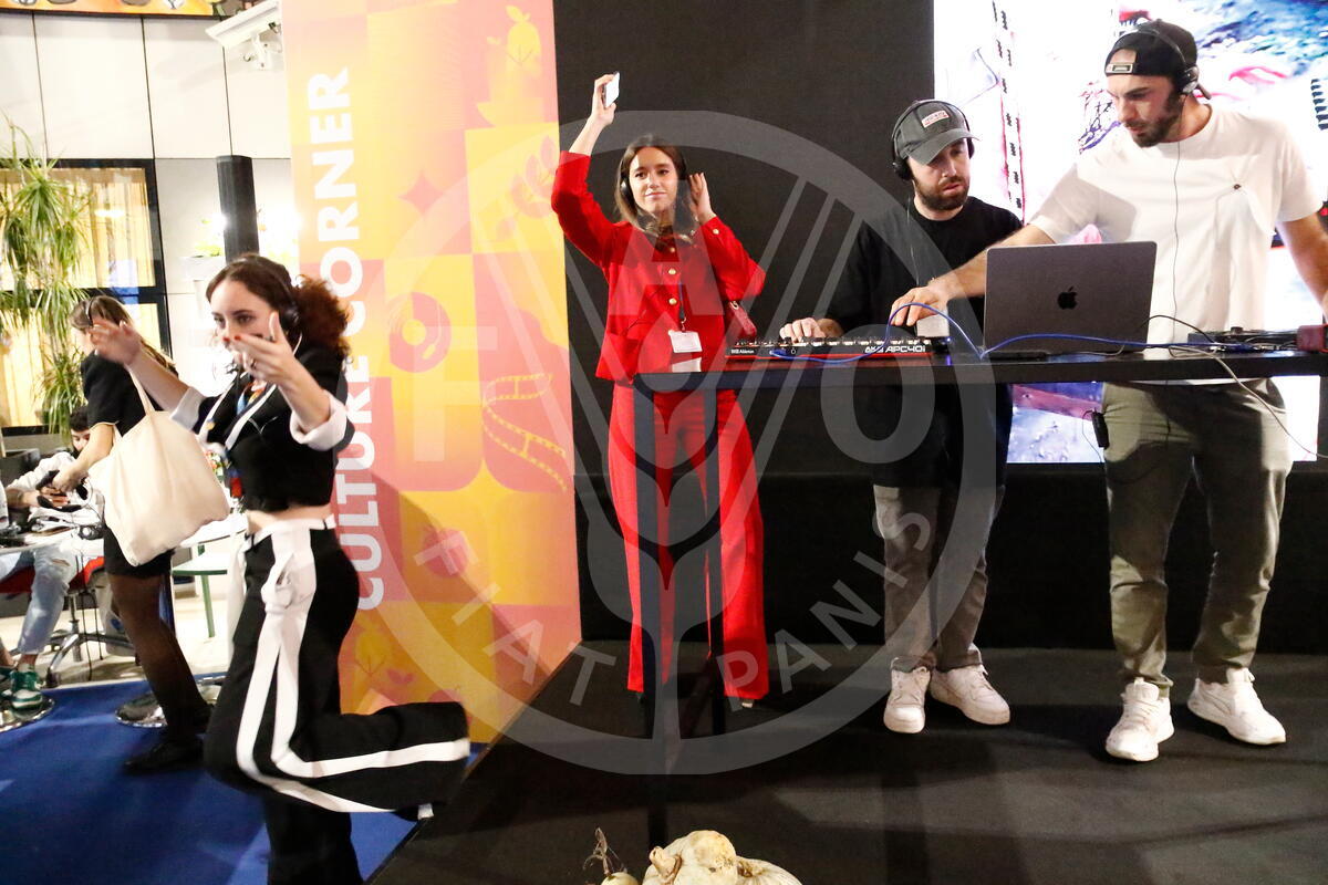16 October 2024. Culture Corner, FAO Headquarters, Rome, Italy. At the World Food Forum 2024, on World Food Day, participants and delegates unwind during a silent disco held after the days proceedings.
