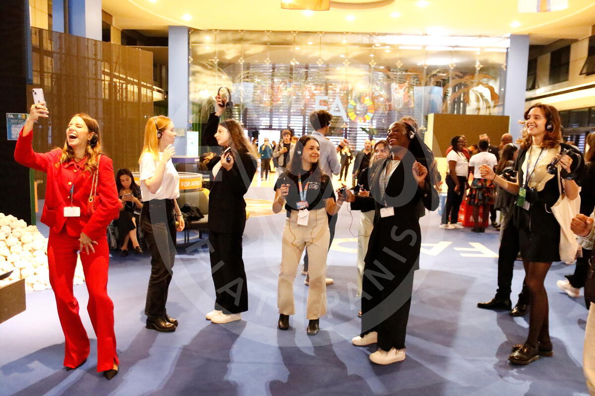 16 October 2024. Culture Corner, FAO Headquarters, Rome, Italy. At the World Food Forum 2024, on World Food Day, participants and delegates unwind during a silent disco held after the days proceedings.