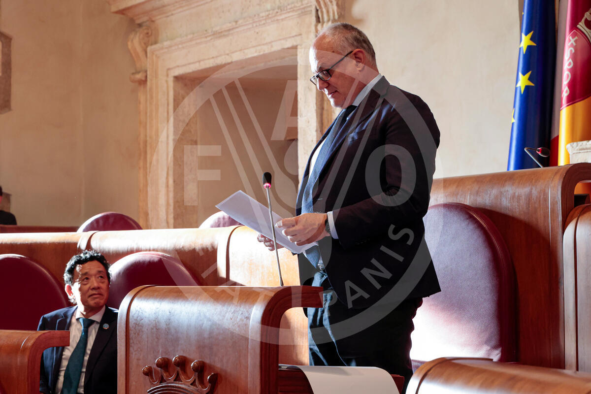 23 July 2025, Rome, Italy. FAO Director-General QU Dongyu, (L) looks at Rome’s Mayor, Roberto Gualtieri, delivering his address during the official launch ceremony of the joint FAO-Roma Capitale campaign “Together for Food Education in Rome's Schools”, at the “Sala della Lupa” in Rome’s Campidoglio.