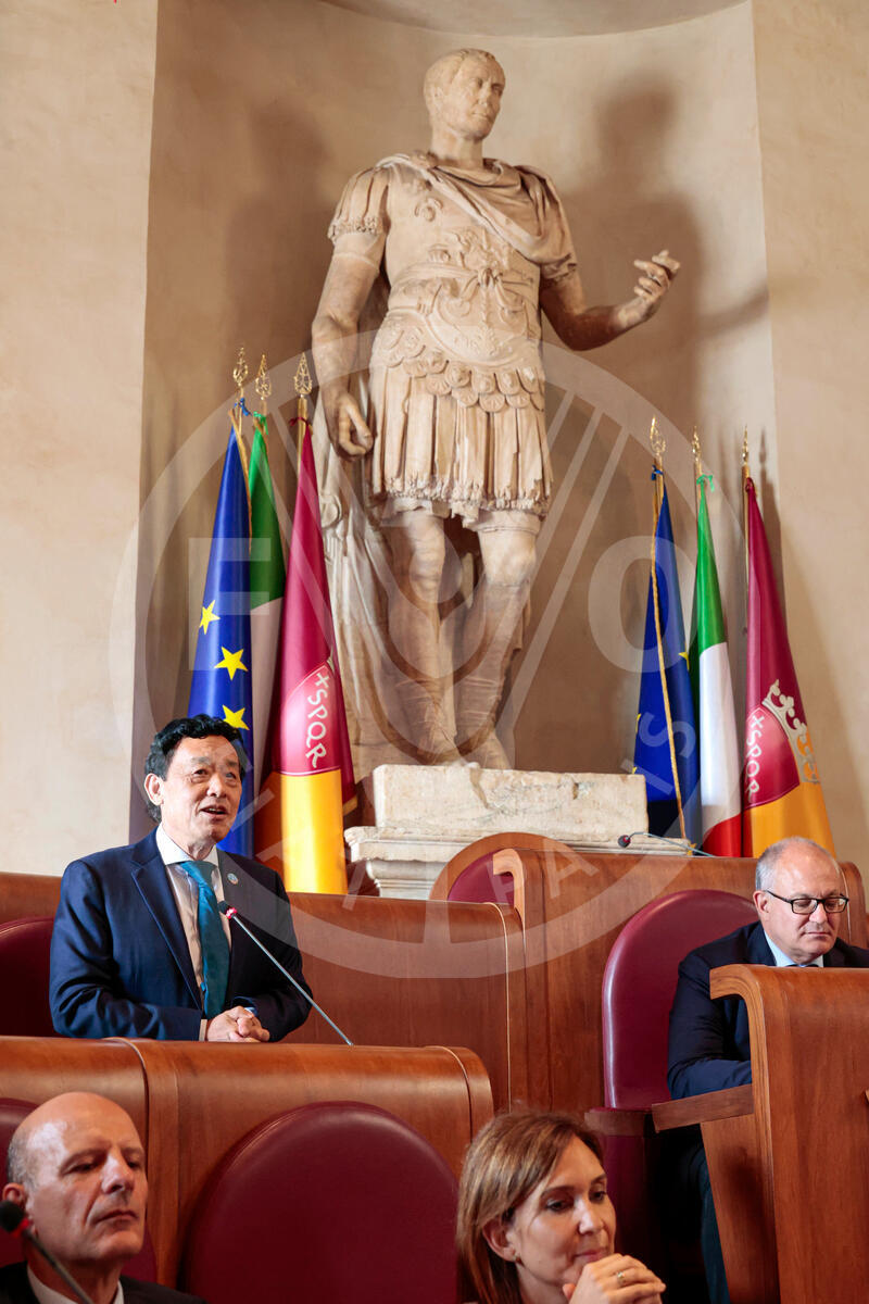 23 July 2025, Rome, Italy. FAO Director-General QU Dongyu, (L), next to Rome’s Mayor, Roberto Gualtieri, delivers his address during the official launch ceremony of the joint FAO-Roma Capitale campaign “Together for Food Education in Rome's Schools”, at the “Sala della Lupa” in Rome’s Campidoglio.