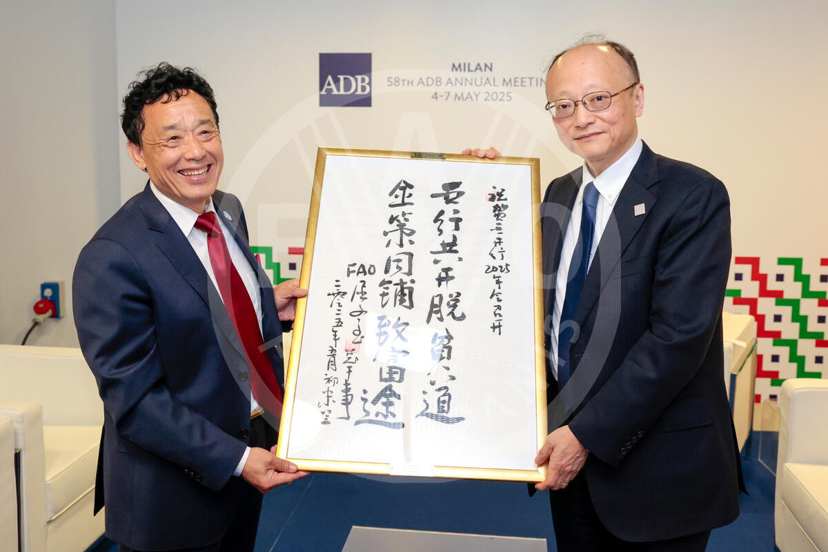 07 May 2025. Milan, Italy. QU Dongyu, FAO Director-General (L) gives his calligraphy as a gift to Masato Kanda, president of the Asian Development Bank (ADB), prior to a signing ceremony of FAO-ADB Framework Agreement.
