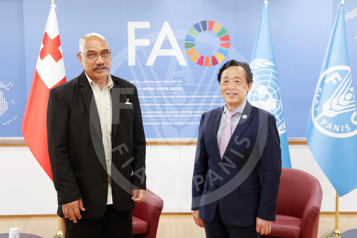 03 July 2025. Rome, Italy. FAO Director-General QU Dongyu meets Tonga Minister for Agriculture, Food and Forests Siosiua Moala Halavatau. FAO headquarters, (Iraq room).
