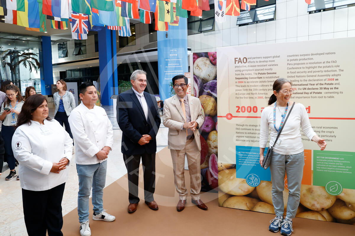 26 May 2025. Rome, Italy. Yurdi Yasmi (Center right), Director of the Plant Production and Protection Division, FAO, José Eduardo González Mantilla (C), Deputy Permanent Representative of Peru, Permanent Mission of Peru to the International Organizations based in Rome visit the exhibition on the occasion of "International Day of Potato" set up at the FAO Atrium. FAO Headquarters.