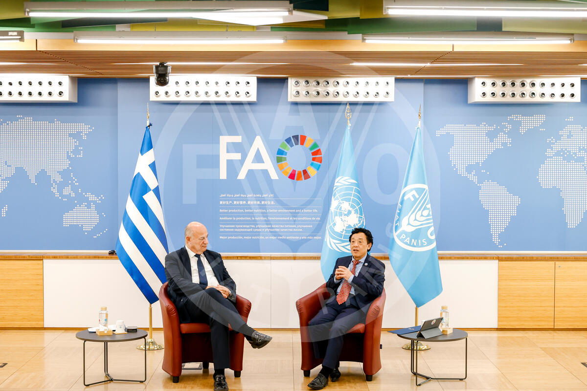 01 July 2025. Rome, Italy. FAO Director-General QU Dongyu meets Greece Minister Rural Development and Food, Konstantinos Tsiaras. FAO headquarters (Iraq room).